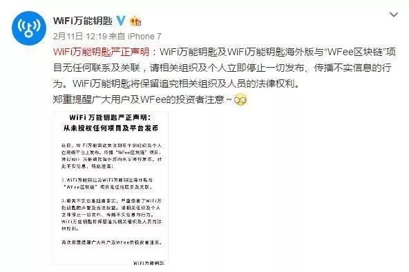 今年年初的时候,在合作伙伴方面,WFee项目方就曾以WiFi万能钥匙海外版的名义进行发币,大肆宣扬。结果马上被WiFi万能钥匙官方发布声明辟谣打脸,表示与WFee毫无关联,并保留追究相关人员的法律权利。