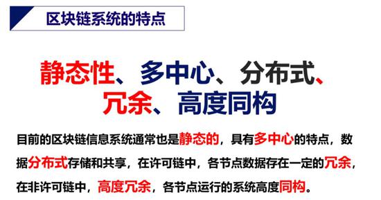 斯雪明还同时介绍了以Fabric为代表的单链许可链的形式化表示,和IOTA的形式化表示。经过对比特币、以太坊、Fabric、IOTA体系结构及其特点的研究,斯雪明总结得出区块链系统的特点。其认为,“区块链系统具有静态性、多中心、分布式、冗余、高度同构等特点。”