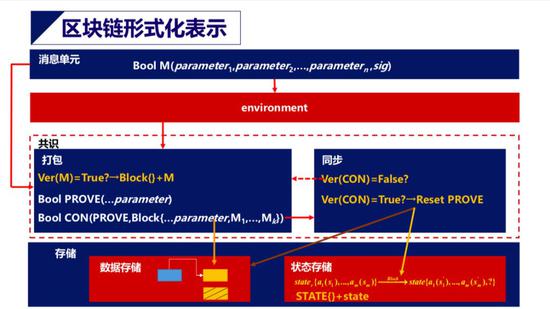 斯雪明表示,区块链系统的一般形式化表示,其中包括单元、共识(包括打包和同步)和存储(包括数据存储和状态存储)的过程。