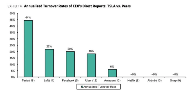萨克纳吉称,根据研究,特斯拉每年更换27%以上的高管,而向马斯克汇报的高管年流动率为44%,“远远高于同类公司向CEO回报的直接报告的流动率。”通常,硅谷其他公司的平均的高层离职率仅为9%。