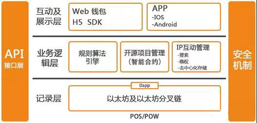 最上层是互动和展示层处理与平台和其他参与者的互动、行为挖矿,即区块链信息的使用,比如钱包功能。