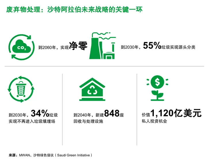 依托“沙特2030愿景”及绿色倡议,当地环保市场潜力持续释放。沙特政府为水利项目规划800亿美元拨款,水务合作公司(SWPC)拟启动18个新水务项目,总价值达120亿美元;废弃物处理领域迎万亿级机遇,计划2040年新建848座回收处理设施,2030年实现55%垃圾源头分类、34%垃圾不进入填埋场,私人投资机会超1120亿美元。